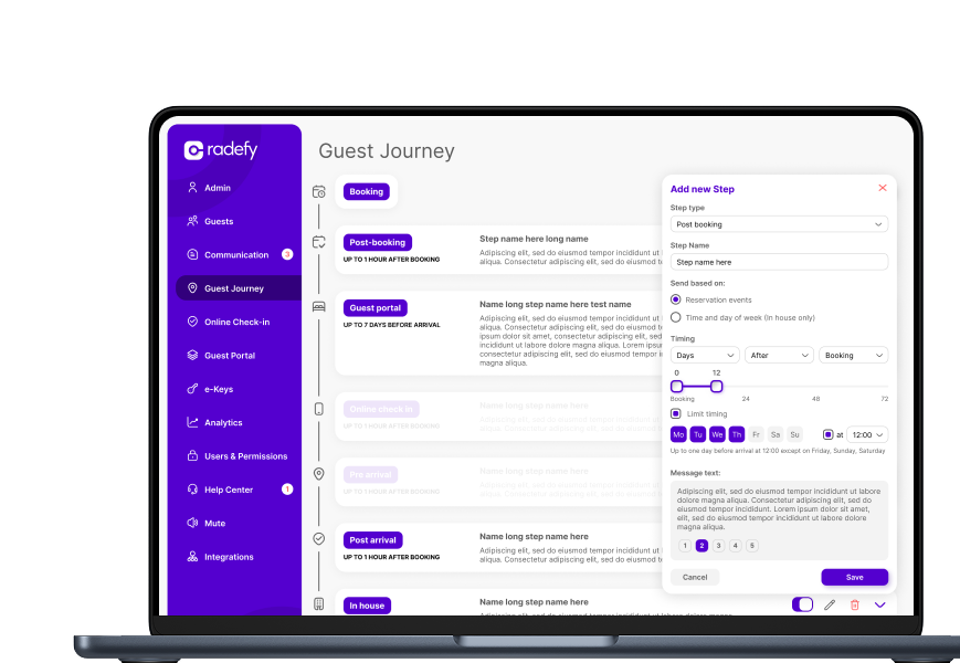 Ο AI βοηθός για Ξενοδοχεία και Property Managers Βραχυχρόνιας Μίθωσης της Radefy, με αυτοματοποιημένη αποστολή μηνυμάτων μειώνει τον φόρτο προσωπικού μέσω αυτόματης κατηγοριοποίησης αιτημάτων, άμεσων απαντήσεων σε FAQs και δρομολόγησης από ενιαίο inbox. Αυτοματοποιημένα μηνύματα Guest Journey και self-service (e-keys, Ψηφιακοί οδηγοί, Τοπικές εμπειρίες, Transport, Concierge, Housekeeping και πολλά άλλα ) επιταχύνουν λύσεις.