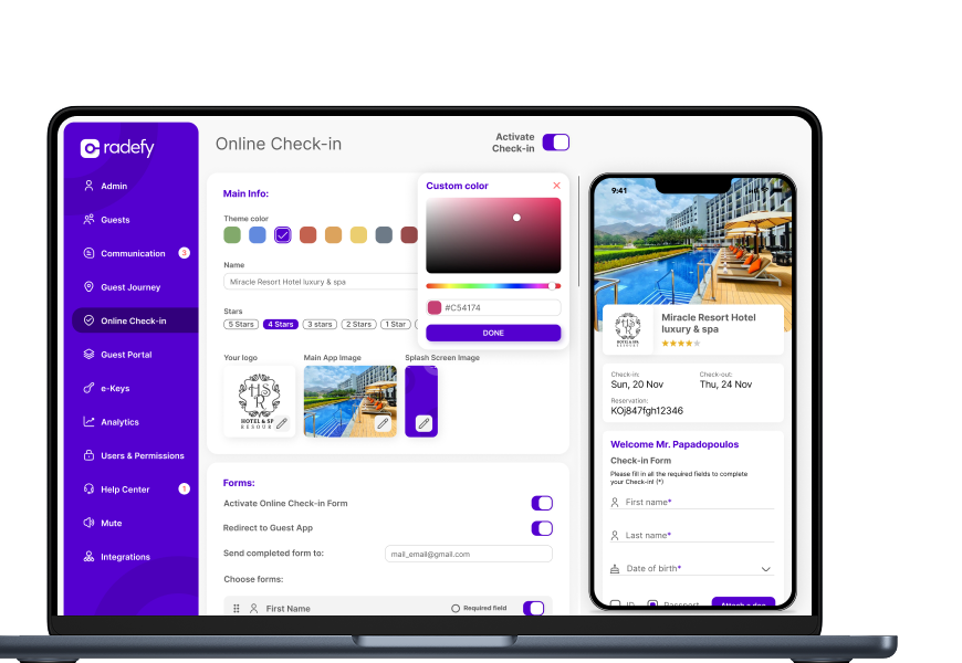 Το Contactless Check-in της Radefy απλοποιεί τις αφίξεις: οι επισκέπτες συμπληρώνουν ψηφιακά τα στοιχεία και ανεβάζουν την ταυτοποίηση (ID) τους πριν την άφιξη. Μέσω διασύνδεσης με το PMS/Channel Manager, η Radefy δημιουργεί και αποστέλλει αυτόματα e-Key (προσωπικό κωδικό πρόσβασης) με SMS, WhatsApp και email.